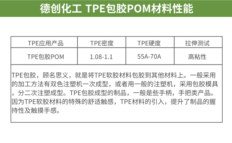 3.絕大多數(shù)情況下都是和硬膠進行包膠成型的,包膠的機理是硬膠與軟膠能實現(xiàn)結(jié)合面的熔接,硬膠與軟膠的極性應(yīng)比較接近。因此,硬膠的種類不同,所采用的TPE物性及牌號也不同。一般來說特殊極性和表面特性的材料,均需要特殊的TPE配混料來包膠。